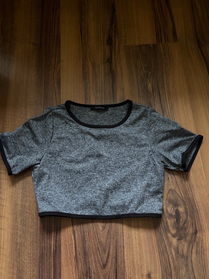 Düz gri renkte, kısa kollu ve bisiklet yaka, vücuda oturan crop top. Pürüzsüz sentetik kumaştan üretilmiştir ve sade tasarımıyla günlük sokak stiline uygundur.