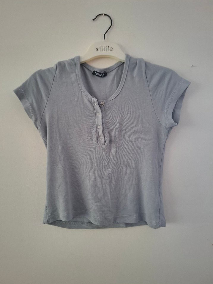 Gri renkli, kısa kollu, düğmeli ve yuvarlak yaka tişört. Yumuşak keten kumaştan, salaş kesim ve sokak tarzına uygun.