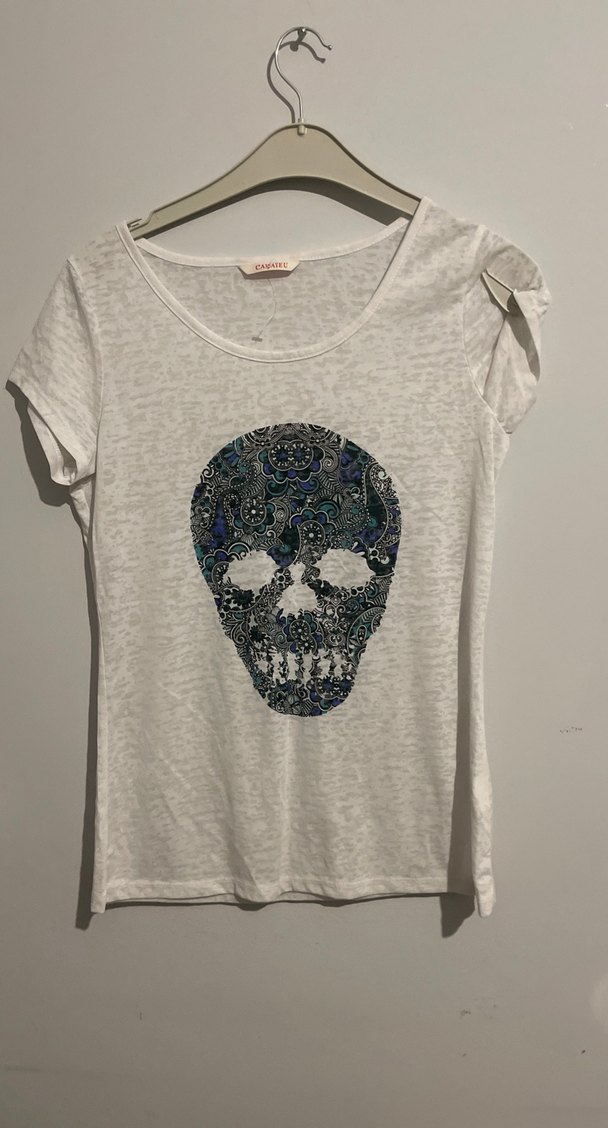 Gri, kısa kollu, rahat kesim kadın tişörtü, önünde renkli kafatası baskısı ve kolda dantel detayı bulunur. Yumuşak sentetik kumaştan, yuvarlak yaka.