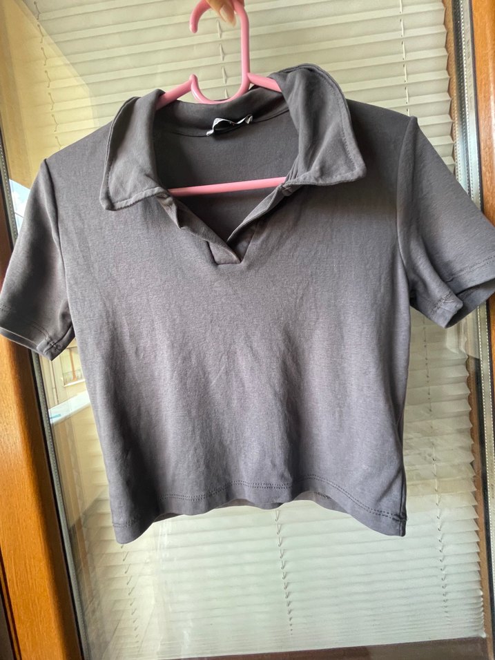 Gri renkli, keten kumaştan, kısa kollu ve yakalı, kızlar için fitted kesim polo tişört. Desensiz, rahat ve şık bir sokak stili sunar.
