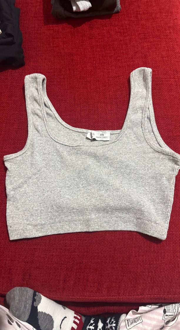 Yumuşak pamuktan yapılmış, bisiklet yaka ve fitted kesim gri kolsuz crop top. Spor ve günlük sokak giyimi için uygundur. ♀️ standart beden yazıyor ama s bedene olur