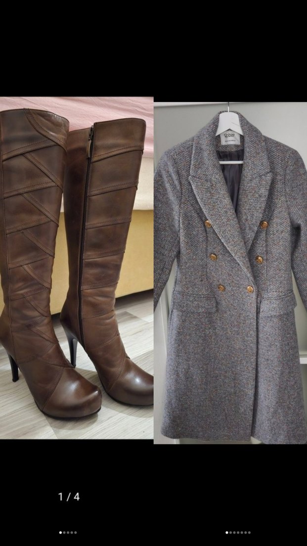 Gri kruvaze kaban, düğmeli klasik kesime sahip. Yan fermuarlı, yüksek topuklu kahverengi deri çizme ile kombinlenmiş.