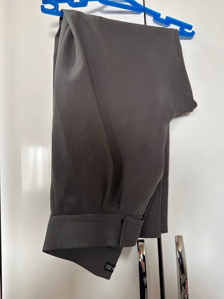 Kadınlar için gri, uzun boy, çıtçıtlı, regular fit kumaş pantolon. Ofis ve sokak stili için uygundur.