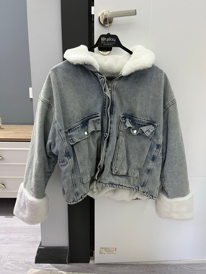 Kadınlar için gri kot ceket, kapüşon ve manşetlerde kürk detaylı, bol kesim ve kısa boyda, bağlama desenli, günlük rahat kullanım için uygun.