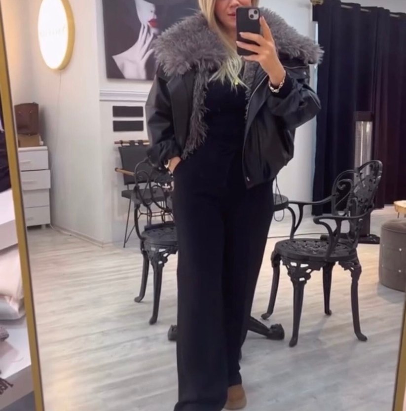 Kadın Gri Kürklü Siyah Deri Ceket standart bedendir