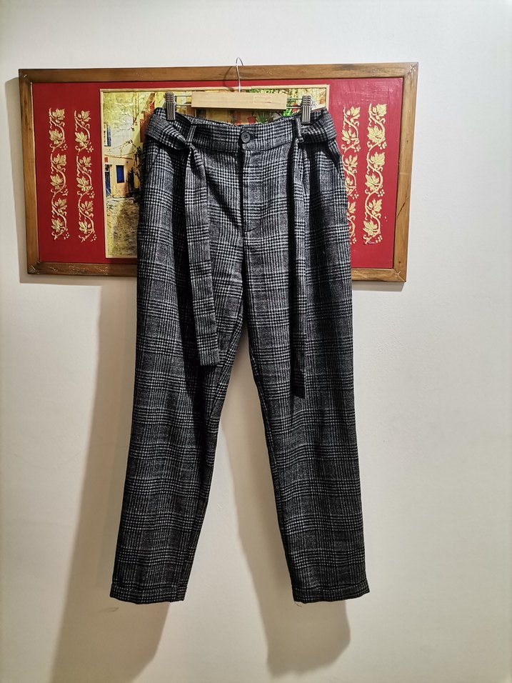 Gri bağcıklı kumaş pantolon,ofis ve günlük sokak stiline uygun, rahat ve şık görünümlü havuç kesim. M beden için daha uygundur