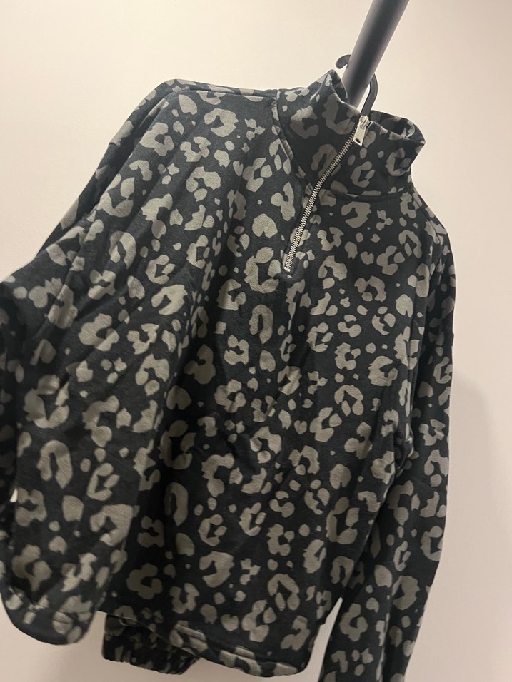 Yumuşak ve sıcak kumaştan, gri leopar desenli, fermuarlı, yüksek yakalı ve bol