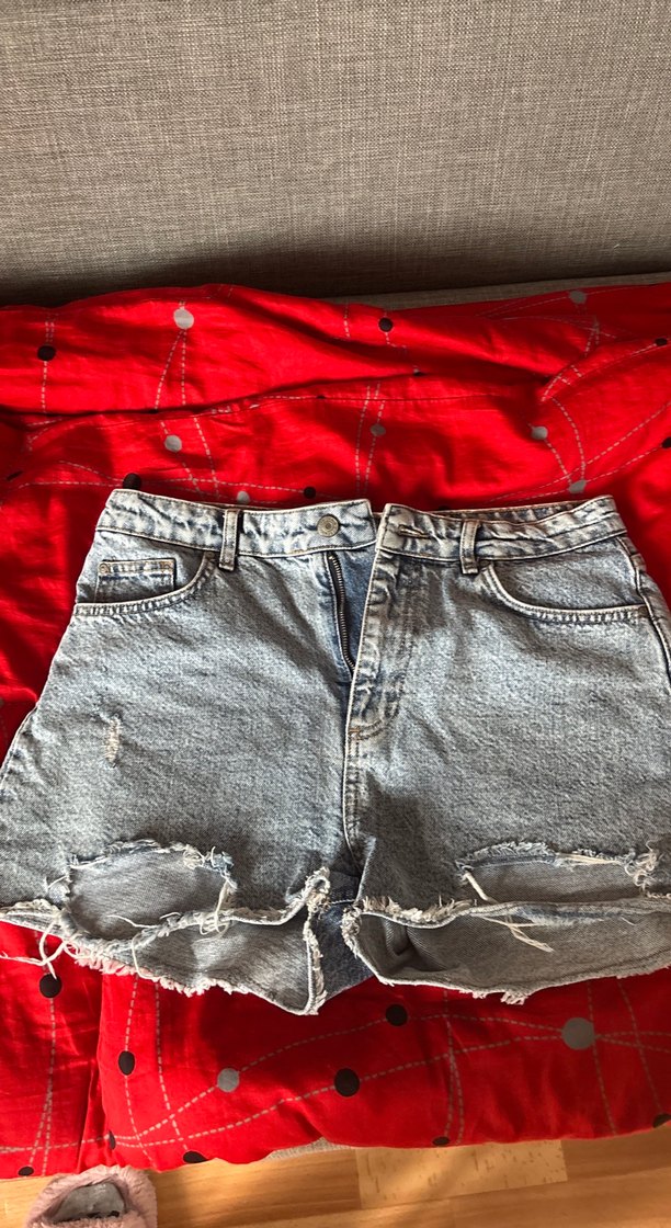 Düğmeli, yırtık detaylı gri loose fit mini denim şort, trend sokak stili için uygundur.