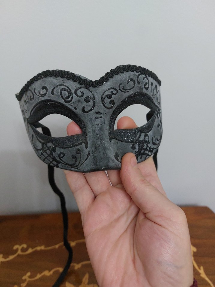 Kadınlar için siyah desenli gri yarım yüz maskesi, arka kısmında siyah elastik bant bulunur. Kostüm veya maskeli balolarda kullanılabilir.