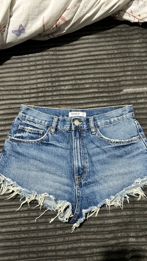 Gri ve mavi bağlamalı desenli, düğmeli, salaş kesim kadın kot mini şort, sokak stiline uygun.