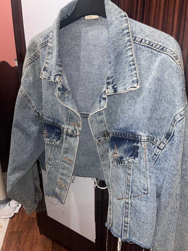 Gri ve mavi tonlarda batik desenli, düğmeli önden, notched lapel yakalı ve bol kesim denim ceket. Normal midi boyda, strappy kollu, günlük sokak stiline uygun.
