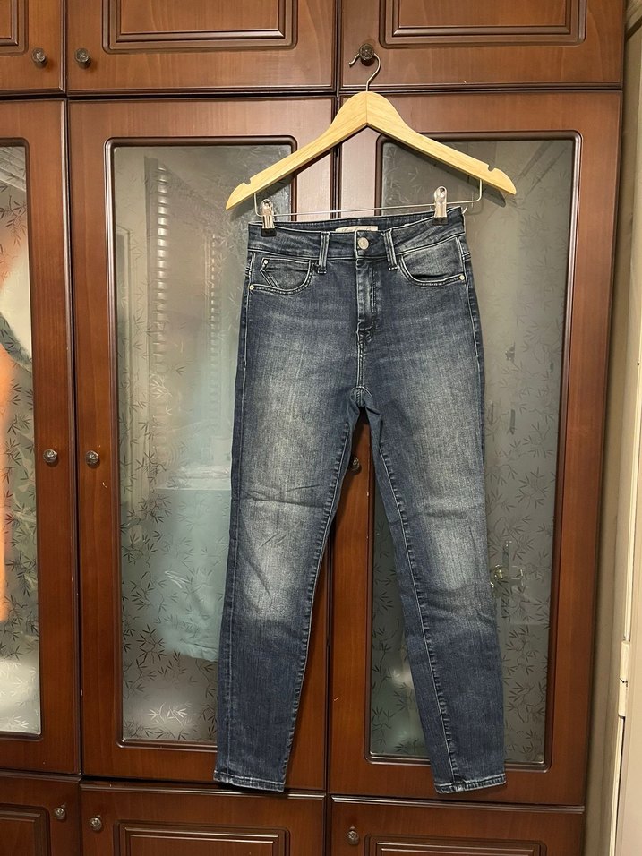 Gri ve mavi batik desenli, kemerli, normal boy regular fit kadın kot pantolon. Günlük rahat ve şık tarz için uygundur. Bel 68 cm boy 91 cm 25/27 bedeni