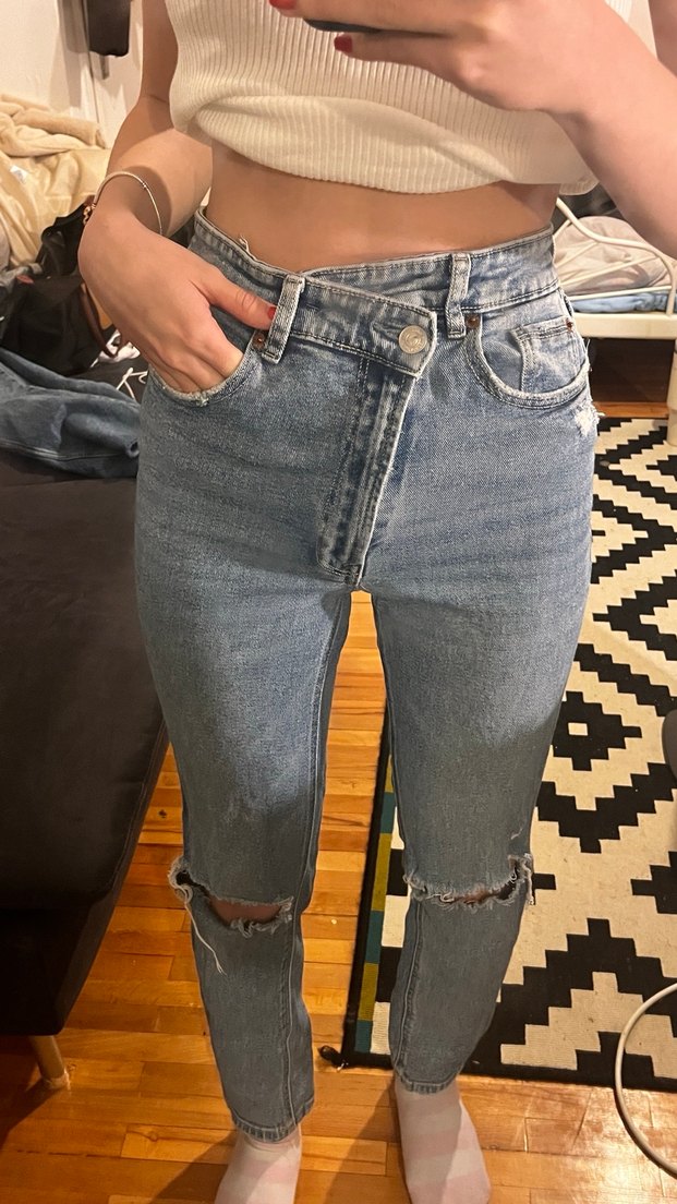 Beli tokalı, gri-mavi bağcıklı denim pantolon, normal midi boyda ve dar kesimli, günlük rahat sokak stili için uygun.