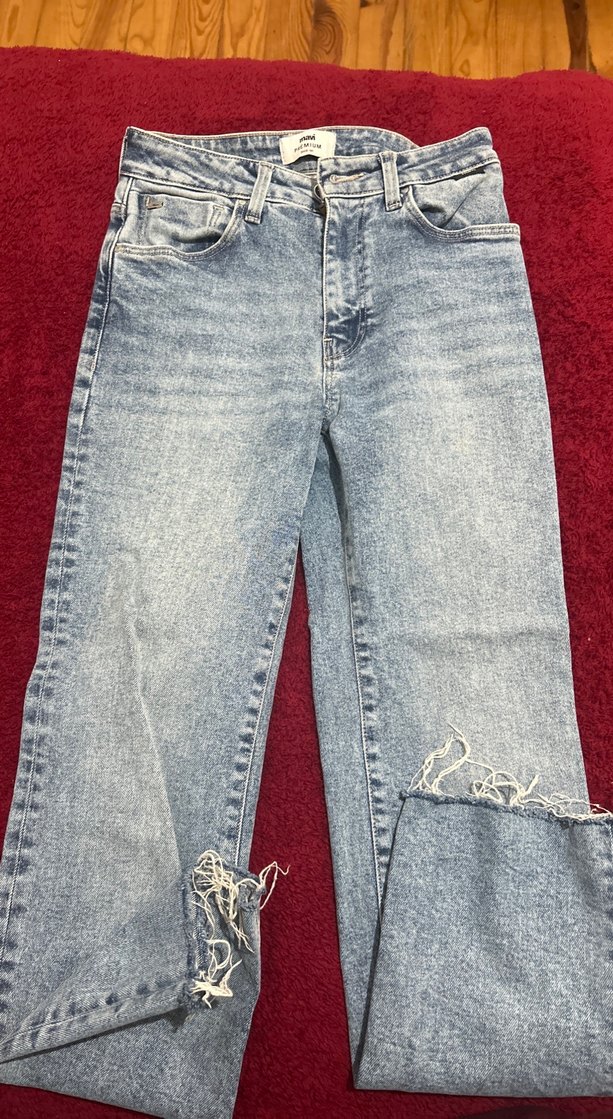 Gri mavi tonlarında, bol kesim ve normal boyda, tokalı detaylara sahip denim pantolon. Midi uzunlukta ve paçalarında hafif yıpranmış görünüm, günlük kullanım için uygundur.