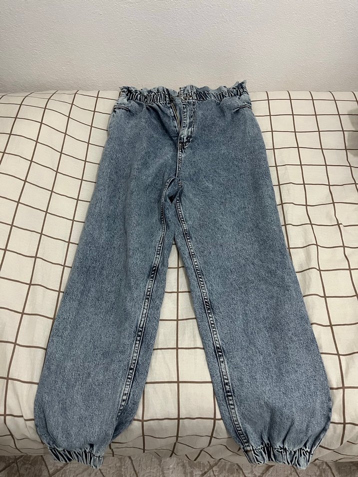 Kadınlar için bol kesim, kemerli ve lastikli paçalı, gri-mavi renkte rahat denim pantolon, günlük sokak stili için uygundur.
