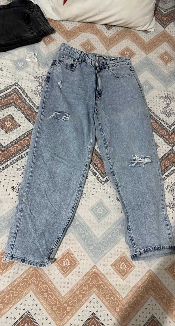 Gri-mavi tonlarında, bol kesim, kemer tokalı kadın kot pantolon. Midi boy ve günlük kullanıma uygun, hafif yırtık detaylı.