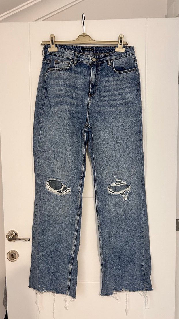 Gri mavi renkte, bol kesim, kot kumaştan kadın pantolon. Dizlerde yırtık detayları ve kemerli tasarımı vardır. Günlük kullanıma uygundur.