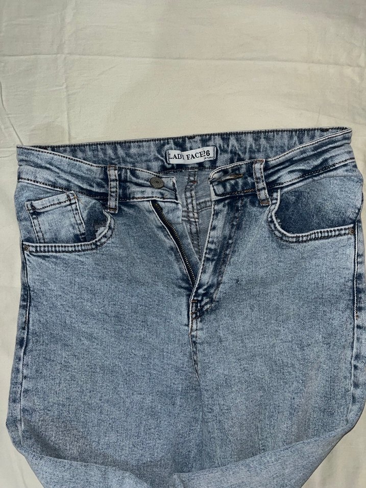 Gri-mavi tonlarda, bol kesim kadın denim pantolon. Normal midi boyda, desen içermeyen rahat günlük kullanım için uygun bir model.