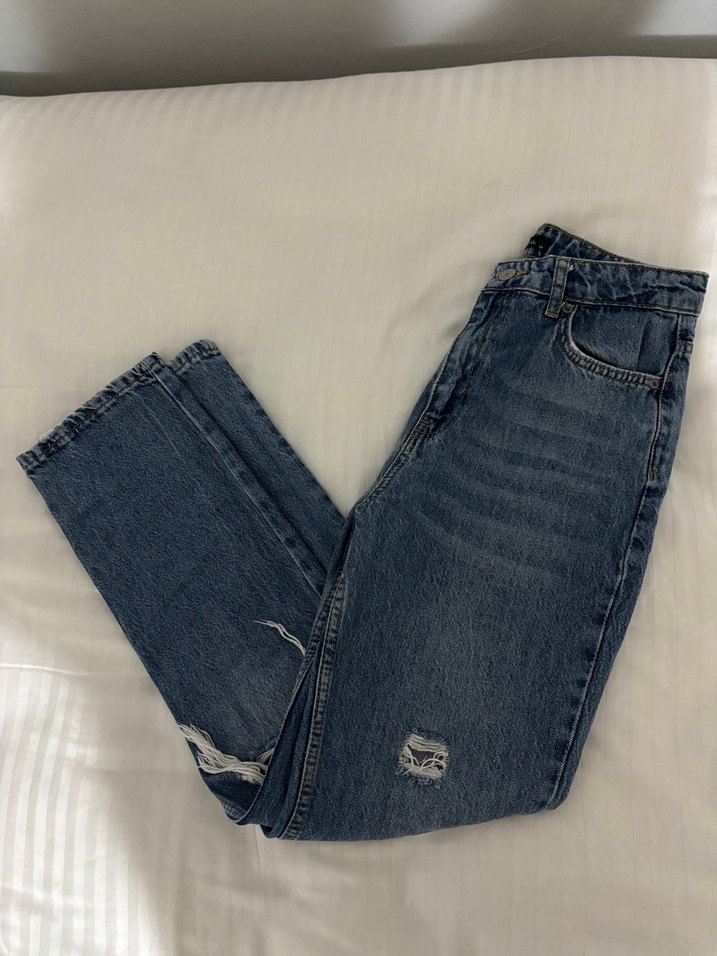 Kadınlar için bol kesim, tokalı detaylı kot pantolon. Dayanıklı denimden, gri-mavi renkte, midi boyda, günlük ve sokak stili için uygundur.