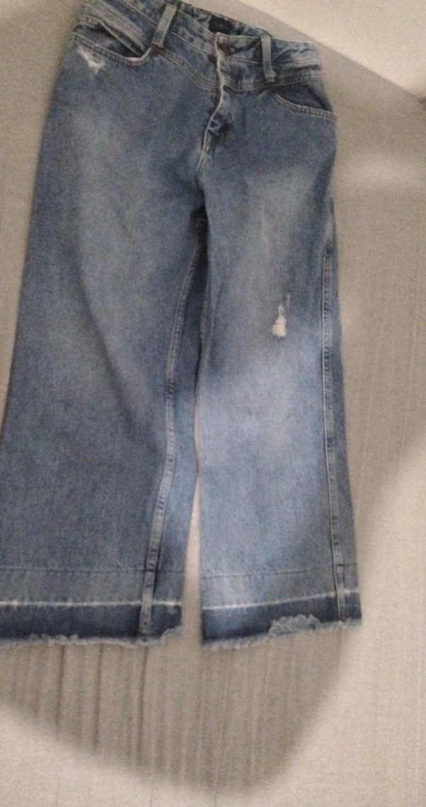 Bol kesim, gri mavi renkte, kot kumaştan yapılmış, tokalı detaylı midi uzunlukta kadın pantolonu. Günlük sokak stili için uygundur.