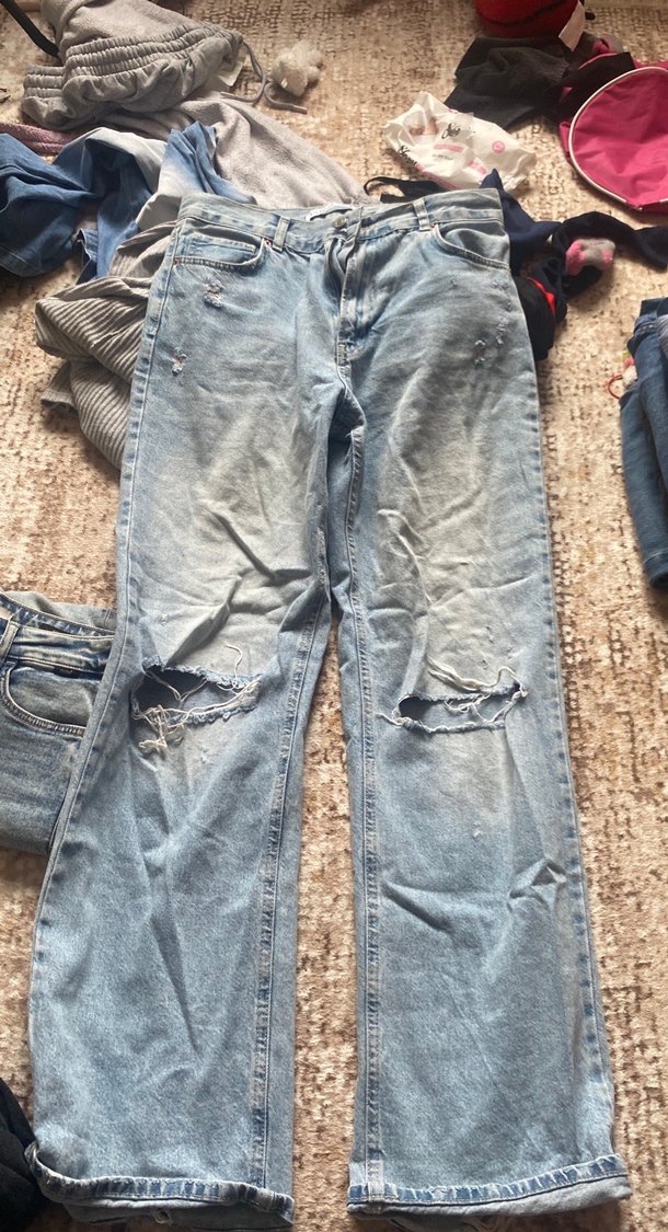 Gri mavi tonlarda, bol kesim, tokalı detaylı kadın midi kot pantolon. Günlük kullanıma uygun rahat sokak stili.
