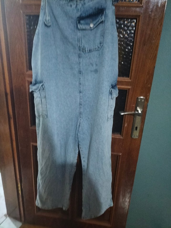 Bol kesim, uzun boy kadın kot pantolon, gri-mavi renk, kemerli ve çok cepli, günlük rahat sokak stili için uygundur.