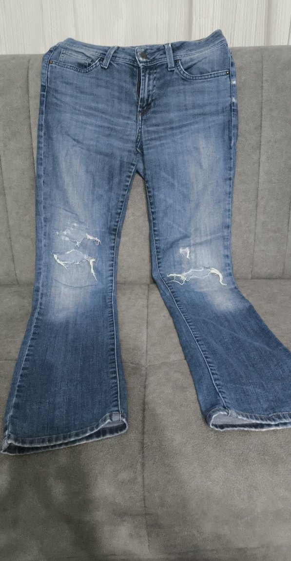 Kadınlar için bol kesim, midi boy, tokalı detaylı kot pantolon. Denim kumaştan, gri-mavi renkte, yıpranmış görünümlü, günlük sokak stili için uygun.