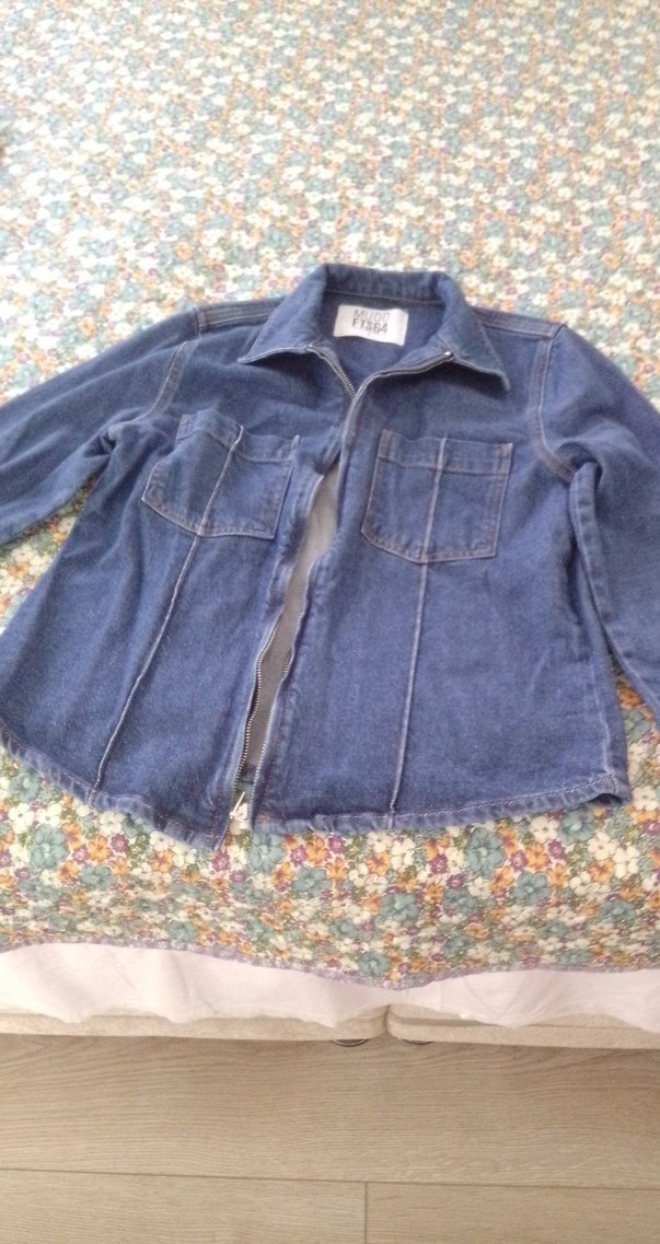 Kadınlar için gri-mavi tonlarında, fermuarlı, bol kesim, uzun kollu denim ceket. İki göğüs cebi ve kesik yakasıyla gündelik bohem tarz sunar.