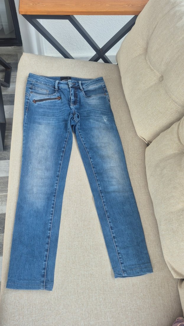 Kadınlar için gri mavi tonlarında denim pantolon. Normal boy ve regular fit, fermuarlı cep detayıyla günlük kullanıma uygun sade bir tarz sunar.