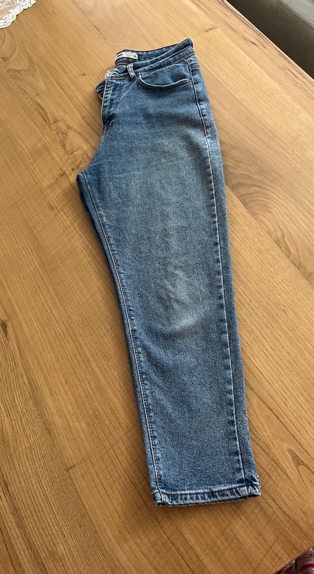 Gri mavi tonlarında, düzenli kesim ve midi boyda kot pantolon. Rahat ve şık, günlük kullanıma uygun.