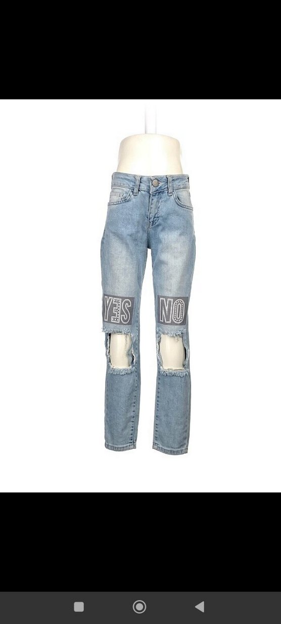 Mavi renkli, bol kesim kadın denim pantolon. Dizlerde yırtık ve gri kemerli detaylar ile 'YES' ve 'NO' baskıları bulunur. Günlük sokak stili için uygundur.