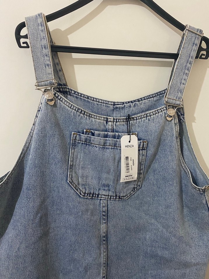 Gri mavi renkte, askılı, tokalı ve ön cepli bol kesim kot tulum. Rahat ve gündelik stil için uygun.