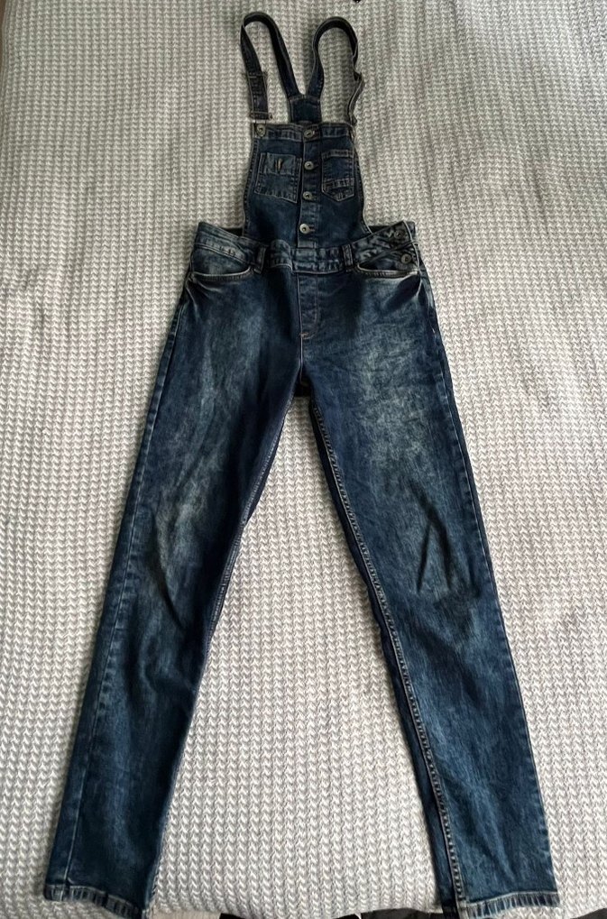 kadin için bol kesim, kot kumaştan yapılmış, ayarlanabilir tokalı askılı, gri-mavi yıkamalı salaş tarzda salopet.