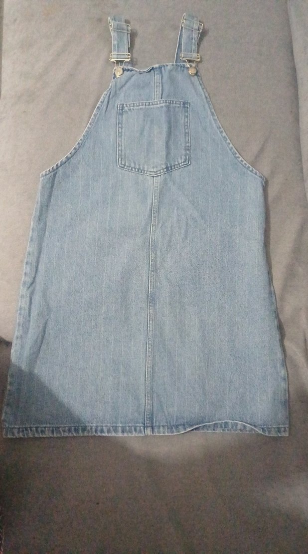 Gri mavi renkli kot kumaştan, düğmeli, cep detaylı, salaş kesim, bisiklet yaka ve kolsuz midi boy kadın tulum. Günlük rahat sokak stili için uygun.
