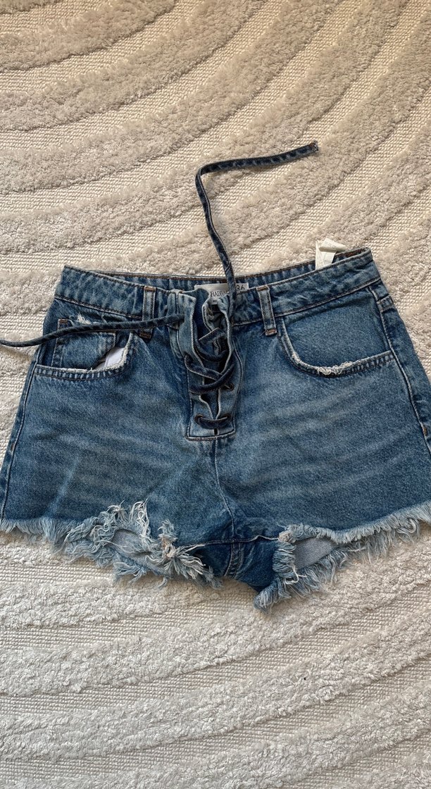 Gri ve mavi tonlarda, kuşaklı ve yırtık detaylı, bol kesim kadın kot mini şort. Rahat ve günlük sokak stili için uygun.