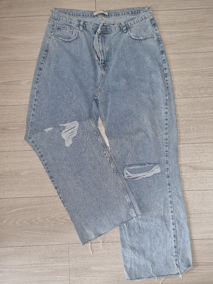 Kadınlar için loose fit ve midi boy, yırtık detaylı gri mavi denim pantolon. Rahat ve günlük sokak stili için uygundur. Hiç giymedim.