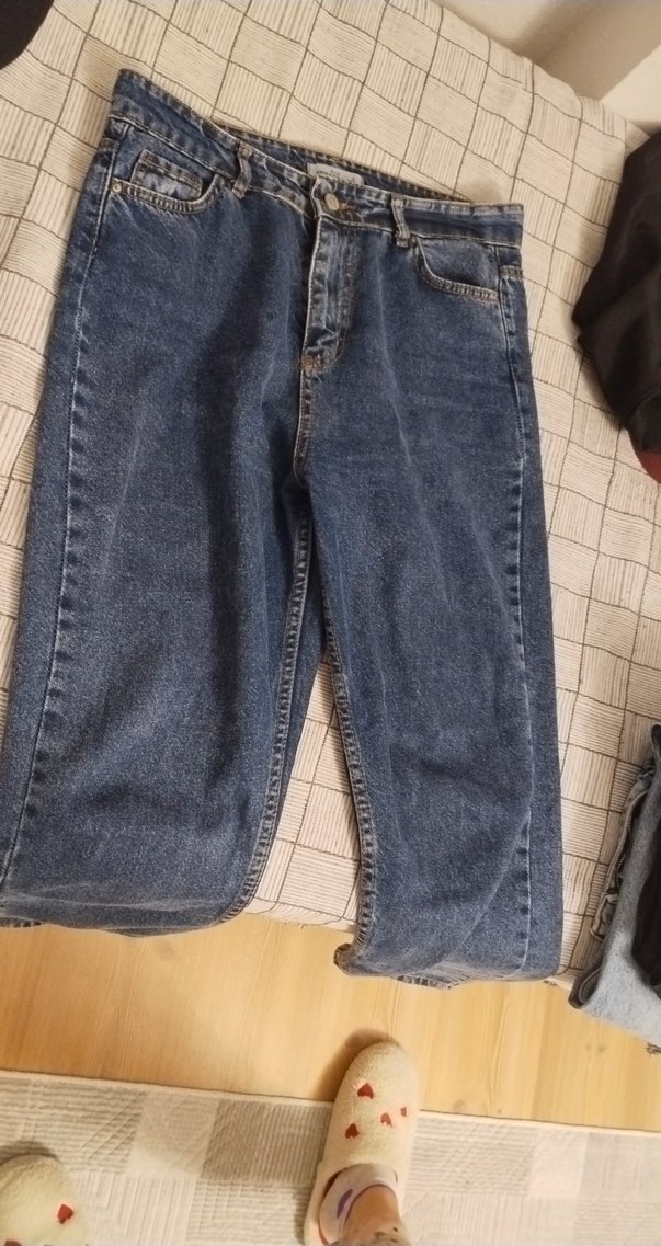 Kadınlar için normal midi boyda, bol kesim ve denim kumaştan üretilmiş jean. Düz, mavi-gri renkli ve rahat günlük kullanıma uygun.