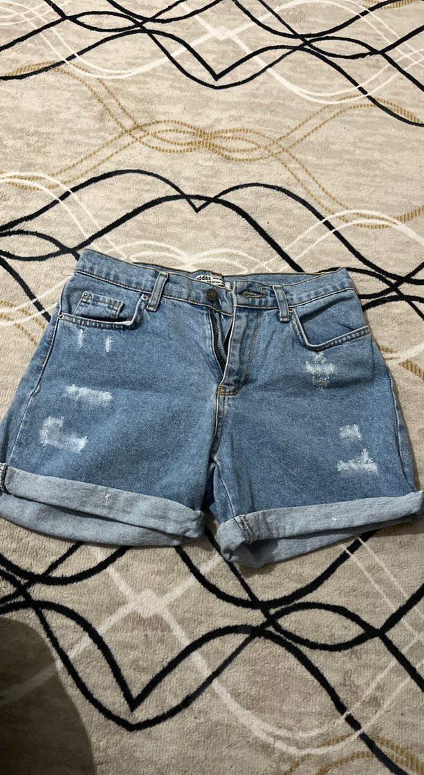 Gri mavi renklerde, kısa boy, bol kesim kadın denim şort. Hafif yıpratılmış detaylarıyla rahat ve şık bir günlük stil sunar.