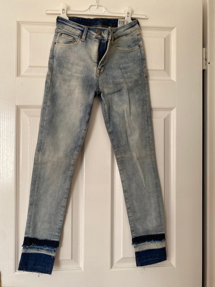 Kadınlar için normal kesim Kot kumaştan, gri-mavi yıkamalı ve kot uçları kesik, günlük kullanım için uygun. Hiç kullanılmamıştır kusuru yoktur
