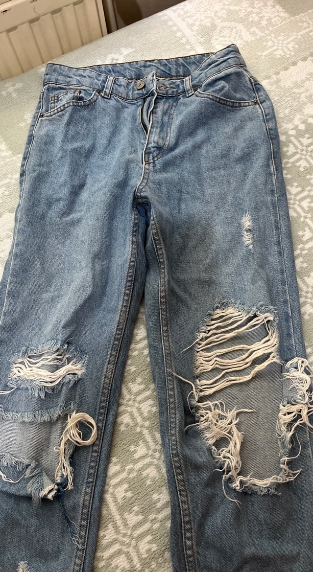 Kadınlar için gri-mavi renkte, bol kesim ve yırtık detaylı, kemerli kot pantolon. Midi boyda, grunge punk tarzına uygun rahat kesim.