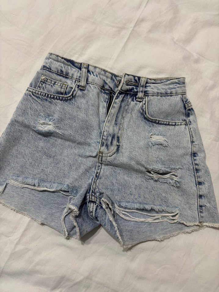 Kadınlar için gri-mavi renkli, salaş kesim mini uzunlukta denim şort. Yıpranmış detaylarla gündelik kullanıma uygun rahat sokak stili sunar.
