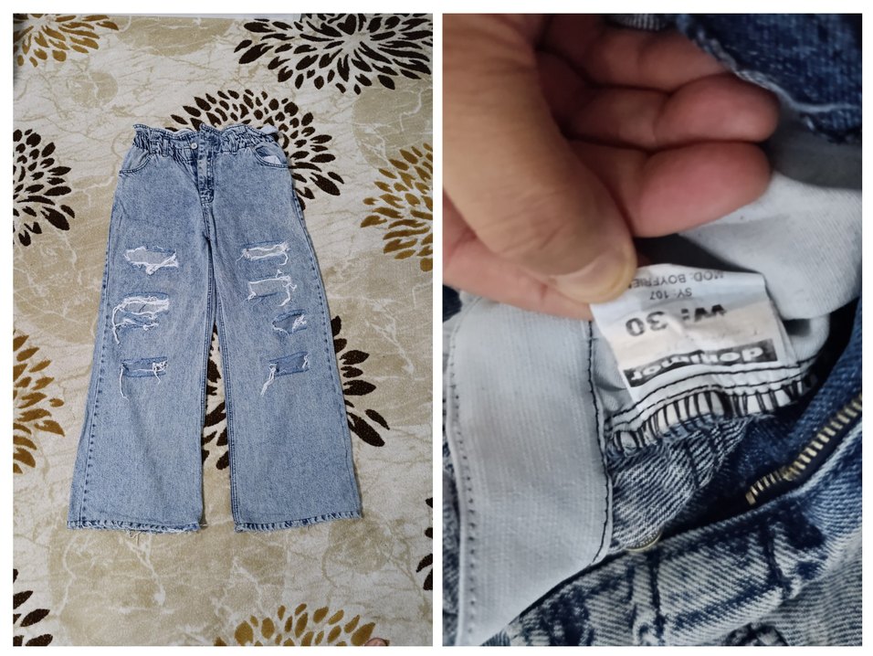 Salaş kesim, gri ve mavi tonlarda tie-dye desenli kadın kot pantolon, tüy detaylı. Günlük rahat kullanım için uygundur.