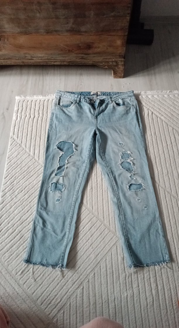 Kadınlar için bol kesim, yırtık detaylı, tokalı gri mavi denim jean. Rahat ve günlük sokak stiline uygun.