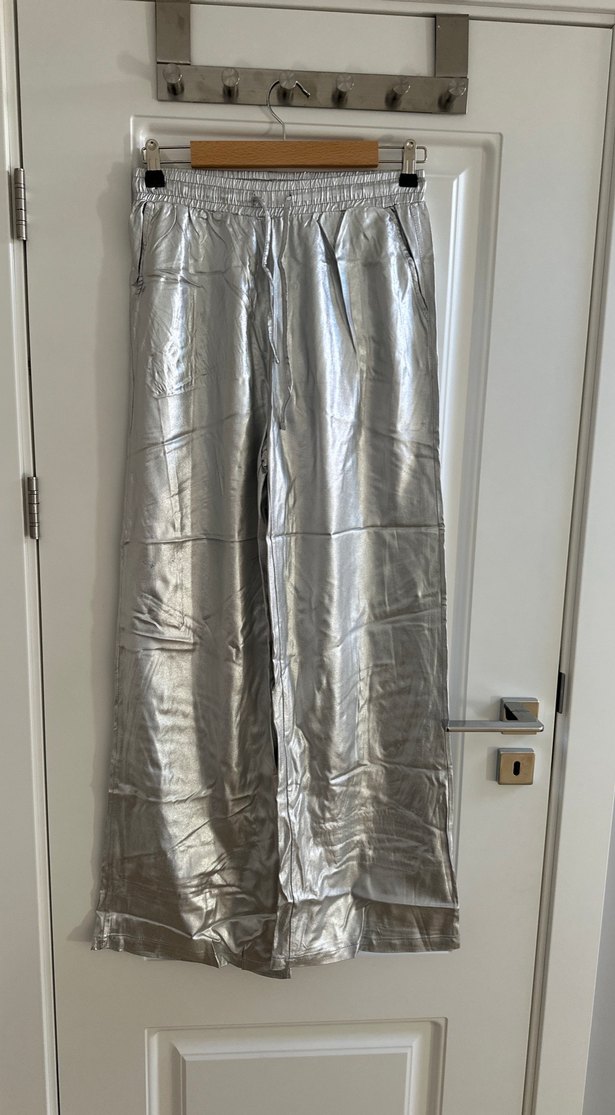 Kadınlar için metalik gri, parlak kumaştan bol kesim ve uzun boy pantolon, sokak modasına uygun. ✨hiç giyilmedi ancak sağ bacakta ufak deformasyonlar oluşmuş