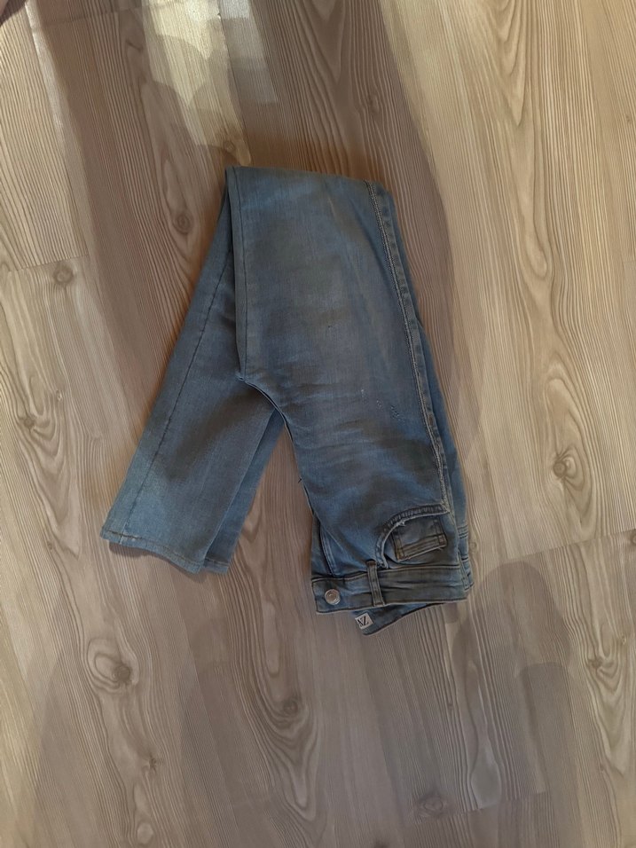 Açık mavi renkte, dar kesim ve midi boyda, tokalı detaylı kadın kot pantolon. Denim kumaştan, gündelik kullanım için uygundur.