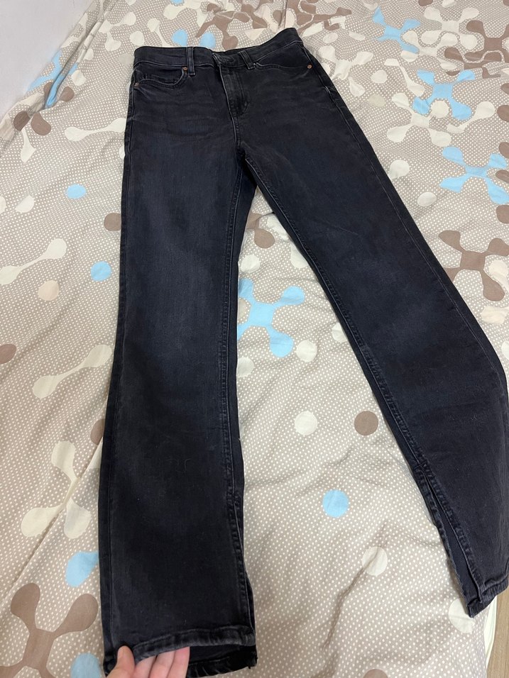 Kadınlar için koyu gri, batik desenli ve yırtmaçlı, oturan kesim midi boy denim pantolon. Günlük kullanıma uygun rahat sokak stili.