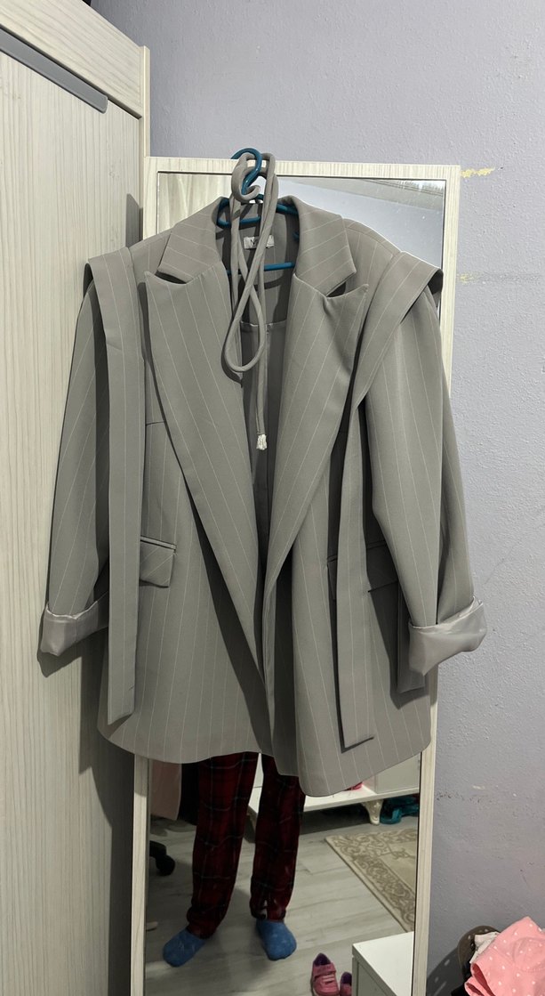Kadın gri midi ceket, kesik yaka ve kemerli bel ile. Strappy kollu, regular fit ve sentetik kumaştan. Ofis ve günlük sokak stili için uygun.