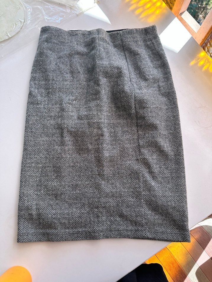Gri renkli midi boy kalem etek, düz kesim ve pile detaylarıyla, sentetik kumaştan ofis kullanımı için uygundur. ️