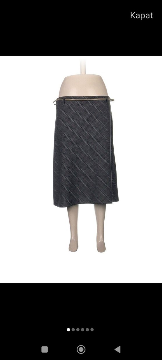 Kadınlar için kemerli, regular fit midi etek. Gri renkte, yumuşak sentetik kumaştan yapılmıştır. Ofis için uygun, çağdaş iş tarzında.bel 43 boy 64 cm