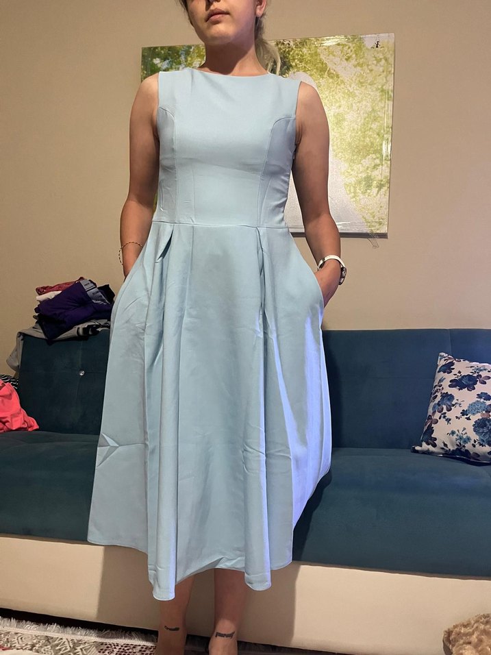 Kadınlar için gri midi elbise, kolsuz ve straplez yakalıdır. Düzenli kesimi ve pileli detayıyla modern klasik tarz sunar, ofis için uygundur.